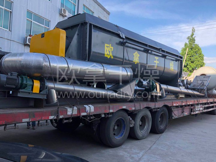 空心軸上密集排列著楔型中空槳葉,熱介質(zhì)經(jīng)空心軸流經(jīng)槳葉。單位有效容積內(nèi)傳熱面積很大,熱介質(zhì)溫度從-40℃到320℃,可以是水蒸汽,也可以是液體型:如熱水、導(dǎo)熱油等。間接傳導(dǎo)加熱,沒有攜帶空氣帶走熱量,熱量均用來加熱物料。熱量損失僅為通過器體保溫層向環(huán)境的散熱。楔型槳葉傳熱面具有自清潔功能。物料顆粒與楔型面的相對運動產(chǎn)生洗刷作用,能夠洗刷掉楔型面上附著物料,使運轉(zhuǎn)中一直保持著清潔的傳熱面。槳葉干燥機的殼體為Ω型,殼體內(nèi)一般安排二到四根空心攪拌軸。殼體有密封端蓋與上蓋,防止物料粉塵外泄而充分發(fā)揮作用。