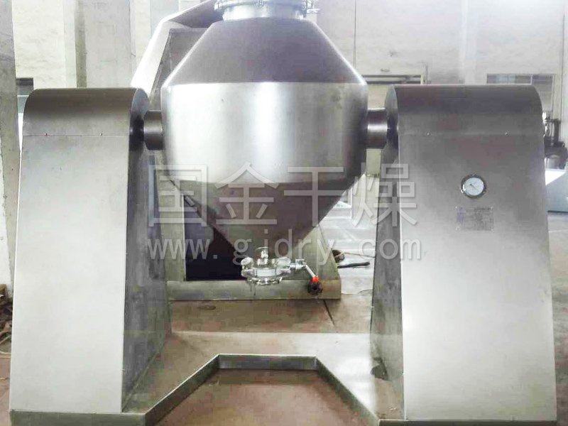 催化劑雙錐回轉真空干燥機為雙錐形的回轉罐體,罐內在真空狀態(tài)下,向夾套內通入蒸汽或熱水進行加熱,熱量通過罐體內壁與濕物料接觸,濕物料吸熱后蒸發(fā)的水汽,通過真空泵經真空排氣管被抽走。由于罐體內處于真空狀態(tài),且罐體的回轉使物料不斷的上下內外翻動,故加快了物料的干燥速度,提高干燥效率,達到均勻干燥的目的。